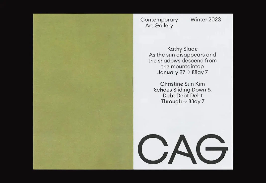 As the freelance designer for the Contemporary Art Gallery (CAG), I leverage the identity created by Post Projects to deliver a wide range of printed materials. This includes meticulously producing program guides, exhibition guides, posters and wall vinyl, ensuring each piece reflects CAG's distinctive aesthetic and mission. Additionally, I have overseen the production of CAG’s permanent exterior signage, street banners, tote bags, business cards, and a diverse array of branded stationery.